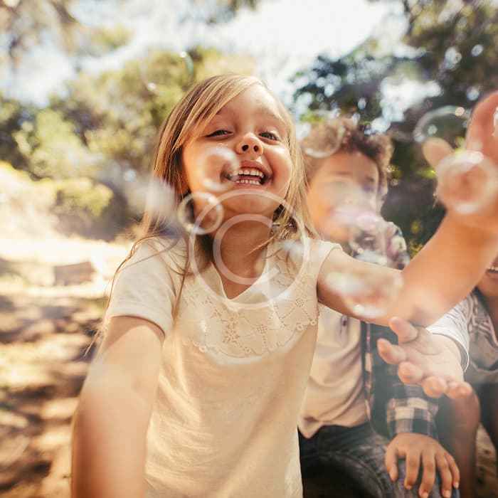 Laughing and chasing floating bubbles